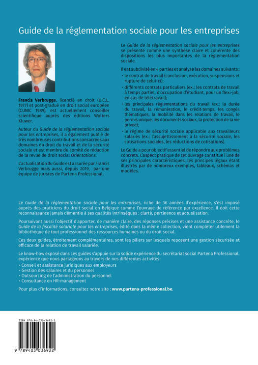 Le guide de la réglementation sociale pour les entreprises est une synthèse claire et cohérente des dispositions les plus importantes de la réglementation sociale. L’ouvrage est destiné aux employeurs, aux responsables de ressources humaines et à tous ceux qui appliquent la réglementation sociale dans les entreprises. Véritable bible dans ce domaine depuis plus de 30 ans, l'ouvrage analyse successivement le contrat de travail, différents contrats particuliers (étudiant, intérimaire, ...), les principales réglementations du travail (horaire, sursalaire, rémunération, ...) et le régime de sécurité sociale applicable aux travailleurs salariés (cotisations, travail des pensionnés, ...).