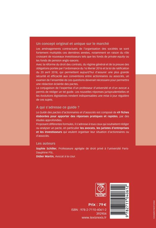 C'est à ces questions que répond le Guide des Pactes d'actionnaires et d'associés. Le Guide des pactes d'actionnaires et d'associés est composé de 49 fiches élaborées pour apporter des réponses pratiques et rapides, par des études approfondies. Proposant différentes formules, il s'adresse à tous ceux qui souhaitent rédiger ou analyser un pacte, en particulier les avocats, les juristes d'entreprises et les investisseurs qui veulent organiser leur situation d'actionnaires ou d'associés.