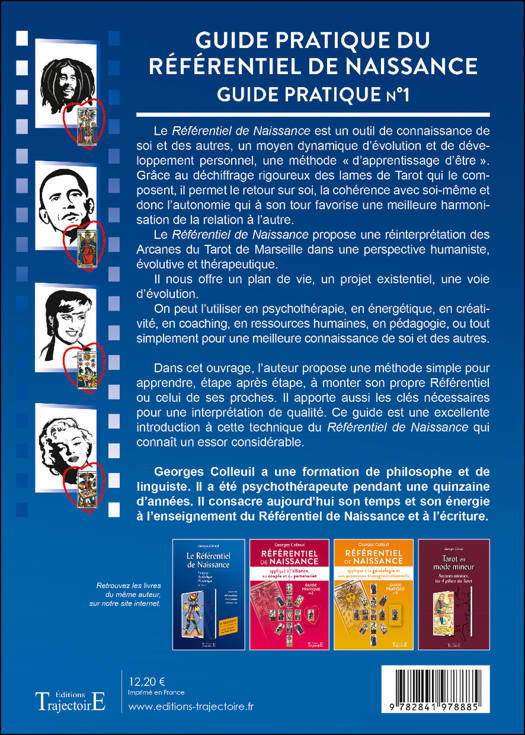 Le Référentiel de Naissance est un outil de connaissance de soi et des autres, un moyen dynamique d’évolution et de développement personnel, une méthode « d’apprentissage d’être ». Grâce au déchiffrage rigoureux des lames de Tarot qui le composent, il permet le retour sur soi, la cohérence avec soi-même et donc l’autonomie qui à son tour favorise une meilleure harmonisation de la relation à l’autre. Le Référentiel de Naissance propose une réinterprétation des Arcanes du Tarot de Marseille dans une perspective humaniste, évolutive et thérapeutique. Il nous offre un plan de vie, un projet existentiel, une voie d’évolution. On peut l’utiliser en psychothérapie, en énergétique, en créativité, en coaching, en ressources humaines, en pédagogie, ou tout simplement pour une meilleure connaissance de soi et des autres. Dans cet ouvrage, l’auteur propose une méthode simple pour apprendre, étape après étape, à monter son propre Référentiel ou celui de ses proches. Il apporte aussi les clés nécessaires pour une interprétation de qualité. Ce guide est une excellente introduction à cette technique du Référentiel de Naissance qui connaît un essor considérable.