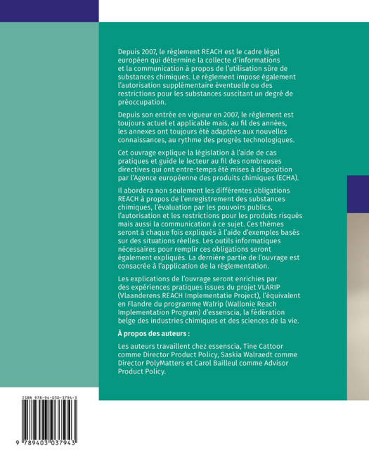Il abordera non seulement les différentes obligations REACH à propos de l’enregistrement des substances chimiques, l’évaluation par les pouvoirs publics, l’autorisation et les restrictions pour les produits risqués mais aussi la communication à ce sujet. Ces thèmes seront à chaque fois expliqués à l’aide d’exemples basés sur des situations réelles. Les outils informatiques nécessaires pour remplir ces obligations seront également expliqués. La dernière partie de l’ouvrage est consacrée à l’application de la réglementation.