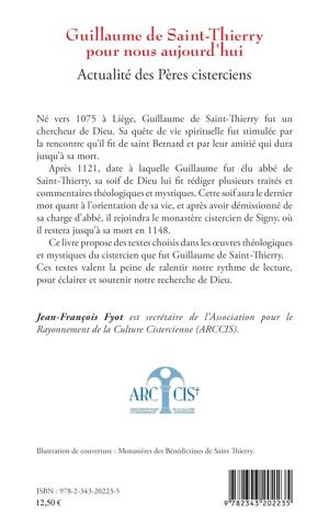 Né vers 1075 à Liège, Guillaume de Saint-Thierry fut un chercheur de Dieu. Sa quête de vie spirituelle fut stimulée par la rencontre qu'il fit de saint Bernard et par leur amitié qui dura jusqu'à sa mort. Après 1121, date à laquelle Guillaume fut élu abbé de Saint-Thierry, sa soif de Dieu lui fit rédiger plusieurs traités et commentaires théologiques et mystiques. Cette soif aura le dernier mot quant à l'orientation de sa vie, et après avoir démissionné de sa charge d'abbé, il rejoindra le monastère cistercien de Signy, où il restera jusqu'à sa mort en 1148. Cet ouvrage propose des textes choisis dans les oeuvres théologiques et mystiques de Guillaume de Saint-Thierry.
