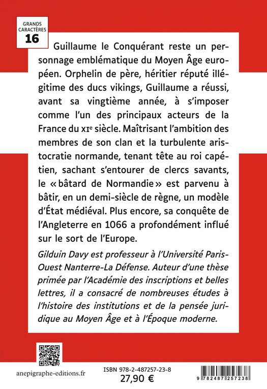 Guillaume le Conquérant reste un personnage emblématique du Moyen Âge européen. Orphelin de père, héritier réputé illégitime des ducs vikings, Guillaume a réussi, avant sa vingtième année, à s'imposer comme l'un des principaux acteurs de la France du xie siècle. Maîtrisant l'ambition des membres de son clan et la turbulente aristocratie normande, tenant tête au roi capétien, sachant s'entourer de clercs savants, le bâtard de Normandie est parvenu à bâtir, en un demi-siècle de règne, un modèle d'État médiéval. Plus encore, sa conquête de l'Angleterre en 1066 a profondément influé sur le sort de l'Europe.