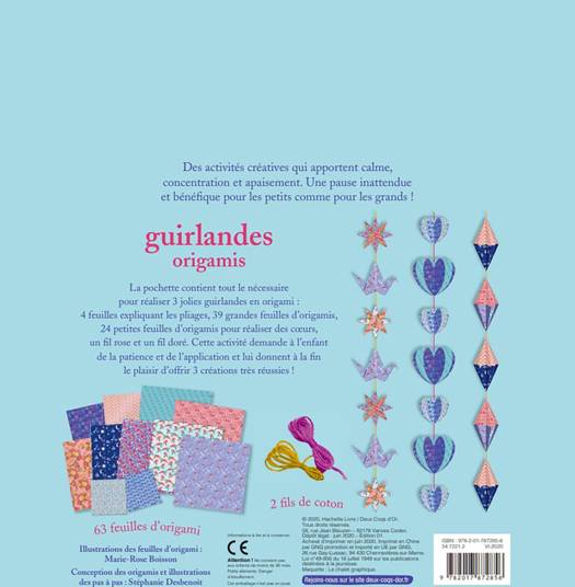 Une pochette contenant 3 guirlandes en origami. Les guirlandes sont à découper, plier et monter à l'aide de pas à pas et de modèles, puis à suspendre grâce à un fil doré.