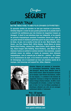 En quarante années de tournées en tant que musicien et journaliste, Christian Séguret a croisé les plus grands guitaristes de la planète dont il a recueilli les confidences pour des dizaines de magazines français ou étrangers. Il réunit ici ces entretiens dans leur intégralité, et les assortit de portraits biographiques ponctués d’anecdotes vécues aux côtés de ces guitar heroes et chanteurs-guitaristes parmi les plus célèbres, piliers du blues, du jazz, de la country et bien sûr du rock. Jimmy Page (Led Zeppelin), Mark Knopfler (Dire Strait), Les Paul, Bonnie Raitt, Willie Nelson, Scotty Moore et James Burton (Elvis Presley), Johnny Cash, Albert Collins, Biréli Lagrène, Steve Cropper (Otis Redding, Blues Brothers), John Mayall et des dizaines d’autres se confient ici comme rarement. Ces musiciens, souvent hostiles aux médias, et lassés de ressasser leurs éléments biographiques, sont ici rassurés par le statut de « confrère » de l’auteur et sa connaissance du sujet, et se livrent comme rarement. Un témoignage rare et surprenant sur tous ces monstres sacrés de la musique, dont beaucoup sont aujourd’hui disparus.