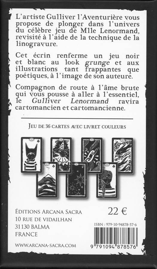 Si ce très attendu petit Lenormand répond aux normes classiques du jeu de cartes mythique, il se démarque incontestablement non seulement par sa qualité et sa maniabilité, mais aussi et surtout par son esthétique. Et pour cause. Julie Lapierre, alias Gulliver l’aventurière – qu’on ne présente plus ! - a joué de son pinceau expert pour livrer des illustrations exclusivement en noir et blanc, dont les symboles sont résolument imprégnés de l’imaginaire averti de leur auteure… À propos de l’auteure Gulliver l’Aventurière est illustratrice et professeur d’arts-plastiques à Strasbourg. Passionnée par l’ésotérisme et tout particulièrement la divination, elle illustre son premier tarot en 2013. Elle en fera depuis une spécialité. Elle fait également partie d’un collectif d’illustrateurs, « L’atelier du Bain aux Plantes », basé à Strasbourg.
