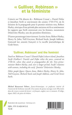 ‘Gulliver, Robinson’ and the feminist Stuck on ‘Robinson Crusoe’s’ (Daniel Defoe’s) desert island, Jonathan Swift (Gulliver’s Travels) and Defoe relive the years, centered on 1710-14, when they acted as propagandists for the Tory prime-minister Robert Harley, and, over a longer period, Swift’s relations with women, including the early ‘feminist’ Delarivière Manley. Other people figure: Queen Anne, Robert Harley, Henry St. John, Nell Gwynne, Richard Steele and Joseph Addison, and Grub Street hacks.