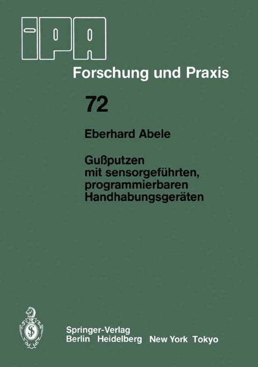 Die vorliegende Arbeit entstand wahrend meiner Tatigkeit als wissenschaftlicher Mitarbeiter am Fraunhofer-Institut fur Produktionstechnik und Automatisierung (IPA), Stuttgart. Mein besonderer Dank gilt dem Leiter des lnstituts, Herrn Prof. Dr. -Ing. H. -J. Warnecke, fur seine groBzugige Unterstutzung und Forderung, die ent- scheidend zur erfolgreichen Durchfuhrung dieser Arbeit beigetragen haben. Herrn Prof. Dr. -Ing. J. Looman danke ich fur die Ubernahme des Korreferats und fur die vielen wertvollen Hinweise, die sich daraus ergaben. Aus dem groBen Kreis der Kollegen des lnstituts, die mich durch ihre Mitarbeit und anregende Kritik unterstutzt haben, mochte ich die Herren Dipl. -Ing. (FH) H. Halm, Dr. -Ing. R. D. Schraft, Dr. -Ing. M. Schweizer sowie Dipl. -Ing. W. Sturz besonders erwahnen. Ihnen allen gilt mein besonderer Dank. Stuttgart 1983 Eberhard Abele I N HAL T S V E R Z E I C H N I S Seite o Abklirzungen und Formelzeichen 12 18 Einleitung 1. 1 Problemstellung 18 1. 2 Zielsetzung und Vorgehensweise 20 21 2 Ausgangssituation 2. 1 Stand der Technik 21 21 2. 1 - 1 Programmierbare Handhabungsgerate 2. 1. 2 Sensoren 21 2. 2 Analyse des Istzustandes in der GuBputzerei 25 25 2. 2. 1 Werkstlickspektrum 28 2. 2. 2 Bearbeitungsverfahren und Werkzeuge 2. 2. 3 Mogliche StorgroBen bei der Automatisierung 31 Anforderungen an Teilsysteme eines programmier- 3 baren GuBputzsystemes 34 34 3. 1 Definition und Aufgaben 3. 2 Teilsysteme zum Ausgleich der Toleranzen 36 36 3. 2. 1 Teilsysteme zum passiven Toleranzausgleich 3. 2.