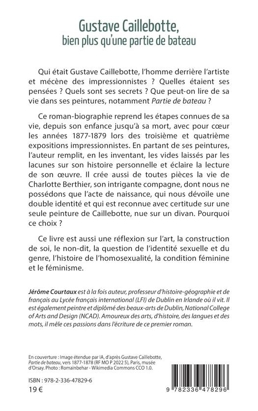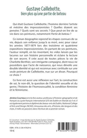 Qui était Gustave Caillebotte, l'homme derrière l'artiste et mécène des impressionnistes ? Quelles étaient ses pensées ? Quels sont ses secrets ? Que peut-on lire de sa vie dans ses peintures, notamment Partie de bateau ? Ce roman-biographie reprend les étapes connues de sa vie, depuis son enfance jusqu'à sa mort, avec pour coeur les années 1877-1879 lors des troisième et quatrième expositions impressionnistes. En partant de ses peintures, l'auteur remplit, en les inventant, les vides laissés par les lacunes sur son histoire personnelle et éclaire la lecture de son oeuvre. Il crée aussi de toutes pièces la vie de Charlotte Berthier, son intrigante compagne, dont nous ne possédons que l'acte de naissance, qui nous dévoile une double identité et qui est reconnue avec certitude sur une seule peinture de Caillebotte, nue sur un divan. Pourquoi ce choix ? Ce livre est aussi une réflexion sur l'art, la construction de soi, le non-dit, la question de l'identité sexuelle et du genre, l'histoire de l'homosexualité, la condition féminine et le féminisme.