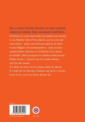 Gustave est né en avril. C'est bientôt son anniversaire. C'est un garçon un peu mélancolique, mais doué de curiosité et d'une grande imagination. Il passe son temps entre la maison, l'école, les visites à l'Ehpad où vient juste d'être placée sa Mamie et parfois un samedi chez son autre grand-mère, Mima. Si Gustave a été triste de voir sa Mamie quitter sa jolie maison, les visites du mercredi avec sa mère lui réservent des moments de joie et de complicité, grâce aux pensionnaires hauts en couleur - la fugueuse Suzanne qui se cache dans les placards ou un vieux colonel adepte du tarot. Gustave comprend que les vieux ont été jeunes : militaire, résistante, cycliste émérite... tous ont été comme lui un enfant. Et comme, décidément, ce mois d'avril est celui de tous les bouleversements pour Gustave, il tombe amoureux de la jolie Sacha pendant son cours de catéchisme et il découvre, par le hasard d'une vieille photo, un sombre secret de famille. Toutes ces images se mélangent dans sa tête, et s'il arrive à les extérioriser à travers le dessin, il sait qu'il vaut mieux se confier, parler et partager. À l'aube de ses dix ans, il sait que sa vie est devant lui.