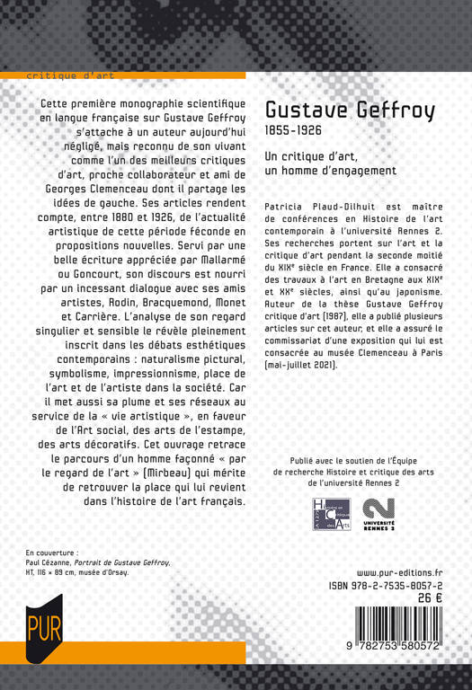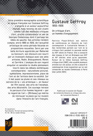 Cette première monographie scientifique en langue française sur Gustave Geffroy s'attache à un auteur aujourd'hui négligé, mais reconnu de son vivant comme l'un des meilleurs critiques d'art, proche collaborateur et ami de Georges Clemenceau dont il partage les idées de gauche. Ses articles rendent compte, entre 1880 et 1926, de l'actualité artistique de cette période féconde en propositions nouvelles. Servi par une belle écriture appréciée par Mallarmé ou Goncourt, son discours est nourri par un incessant dialogue avec ses amis artistes, Rodin, Bracquemond, Monet et Carrière.