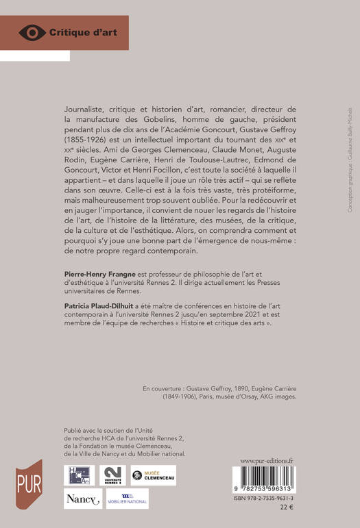 Journaliste, critique et historien d’art, romancier, directeur de la manufacture des Gobelins, homme de gauche, président pendant plus de dix ans de l’Académie Goncourt, Gustave Geffroy (1855-1926) est un intellectuel important du tournant des XIXe et XXe siècles. Ami de Georges Clemenceau, Claude Monet, Auguste Rodin, Eugène Carrière, Henri de Toulouse-Lautrec, Edmond de Goncourt, Victor et Henri Focillon, c’est toute la société à laquelle il appartient – et dans laquelle il joue un rôle très actif – qui se reflète dans son oeuvre. Celle-ci est à la fois très vaste, très protéiforme, mais malheureusement trop souvent oubliée. Pour la redécouvrir et en jauger l’importance, il convient de nouer les regards de l’histoire de l’art, de l’histoire de la littérature, des musées, de la critique,de la culture et de l’esthétique. Alors, on comprendra comment et pourquoi s’y joue une bonne part de l’émergence de nous-même : de notre propre regard contemporain.
