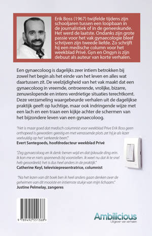 Een gynaecoloog is dagelijks zeer intiem betrokken bij zowel het begin als het einde van het leven en alles wat daartussen zit. De veelzijdigheid van het vak maakt dat een gynaecoloog in vreemde, ontroerende, vrolijke, bizarre, zenuwslopende en intens verdrietige situaties terechtkomt. Deze verzameling waargebeurde verhalen uit de dagelijkse praktijk geeft op luchtige, maar ook indringende wijze met een lach en een traan een kijkje achter de schermen van het bijzondere leven van een gynaecoloog.