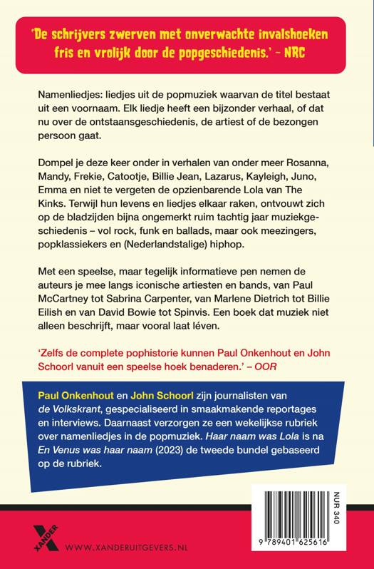 Haar naam was Lola is, na En Venus was haar naam, de tweede columnbundel van het legendarische duo John Schoorl en Paul Onkenhout. Dompel je deze keer onder in verhalen van onder meer Mandy, Catootje, Billie Jean, Jet, Juno en Nancy. Terwijl hun levens en liedjes elkaar raken, ontvouwt zich op de bladzijdes bijna ongemerkt zeventig jaar muziekgeschiedenis - van funk en ballads tot meezingers, popklassiekers en (Nederlandstalige) hiphop.