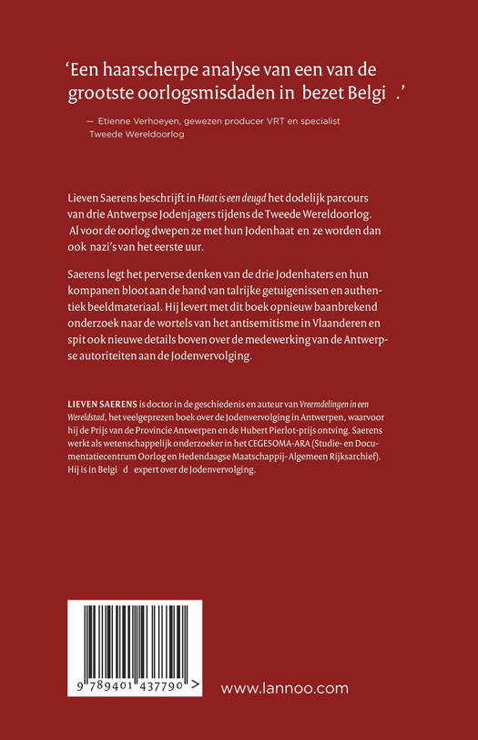 Lieven Saerens beschrijft in Haat is een deugd het dodelijk parcours van drie Antwerpse Jodenjagers tijdens de Tweede Wereldoorlog. Al voor de oorlog dwepen ze met hun Jodenhaat en ze worden dan ook nazi's van het eerste uur. Saerens legt het perverse denken van de drie Jodenhaters en hun kompanen bloot aan de hand van talrijke getuigenissen en authentiek beeldmateriaal. Hij levert met dit boek opnieuw baanbrekend onderzoek naar de wortels van het antisemitisme in Vlaanderen en spit ook nieuwe details boven over de medewerking van de Antwerpse autoriteiten aan de Jodenvervolging.