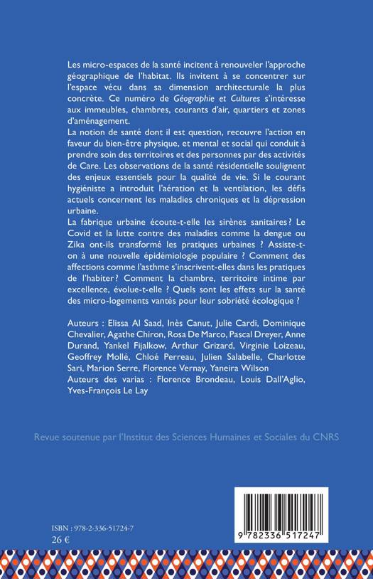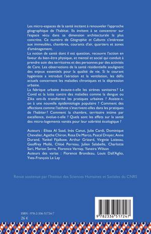 Les micro-espaces de la santé incitent à renouveler l'approche géographique de l'habitat. Ils invitent à se concentrer sur l'espace vécu dans sa dimension architecturale la plus concrète. Ce numéro de Géographie et Cultures s'intéresse aux immeubles, chambres, courants d'air, quartiers et zones d'aménagement. La notion de santé dont il est question, recouvre l'action en faveur du bien-être physique, et mental et social qui conduit à prendre soin des territoires et des personnes par des activités de Care. Les observations de la santé résidentielle soulignent des enjeux essentiels pour la qualité de vie. Si le courant hygiéniste a introduit l'aération et la ventilation, les défis actuels concernent les maladies chroniques et la dépression urbaine. La fabrique urbaine écoute-t-elle les sirènes sanitaires ? Le Covid et la lutte contre des maladies comme la dengue ou Zika ont-ils transformé les pratiques urbaines ? Assiste-t-on à une nouvelle épidémiologie populaire ? Comment des affections comme l'asthme s'inscrivent-elles dans les pratiques de l'habiter ? Comment la chambre, territoire intime par excellence, évolue-t-elle ? Quels sont les effets sur la santé des micro-logements vantés pour leur sobriété écologique ?