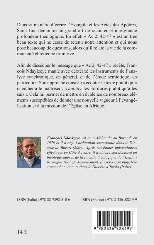 Dans sa manière d'écrire l'Évangile et les Actes des Apôtres, Saint Luc démontre un grand art de raconter et une grande profondeur théologique. En effet, Ac 2, 42-47 est un très beau texte qui ne cesse de retenir notre attention et qui nous pose beaucoup de questions, alors qu'il relate la vie de la communauté chrétienne primitive. Afin de disséquer le message que Ac 2, 42-47 recèle, François Ndayizeye manie avec dextérité les instruments de l'analyse synchronique, en général, et de l'étude sémiotique, en particulier. Son approche consiste à écouter le texte plutôt qu'à chercher à le maîtriser; à habiter les Écritures plutôt qu'à les saisir. Cela lui permet de mettre en évidence de nombreux éléments susceptibles de donner une nouvelle vigueur à l'évangélisation et à la mission de l'Église en Afrique.