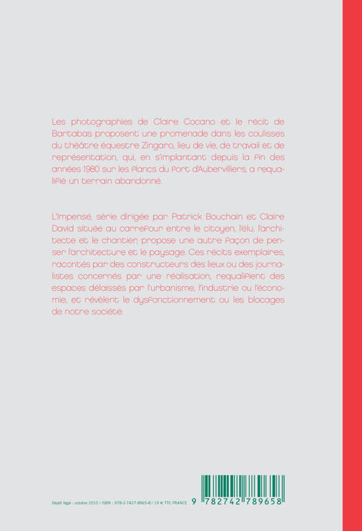 Les photographies de Claire Cocano commentées par Bartabas proposent une promenade sur les lieux du théâtre équestre Zingaro, conçu par l'architecte Patrick Bouchain, implanté depuis vingt ans au sein du Fort d'Aubervilliers.
