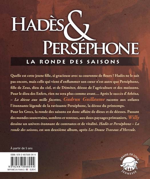 Quelle est cette jeune fille, si gracieuse avec sa couronne de fleurs ? Hadès ne le sait pas encore, mais celle qui vient d'enflammer son coeur n'est autre que Perséphone, fille de Zeus, dieu du ciel, et de Déméter, déesse de l'agriculture et des moissons. Pour le dieu des enfers, rien ne sera plus comme avant⦠Sans hésiter, il capture la belle enfant. Mais que deviendra la Terre, si Déméter, dans sa détresse, refuse son aide aux hommes ? Toute la patience d'Iris, la ruse d'Hermès et la sagesse de Rhéa suffirontelles à adoucir Hadès et Déméter ? Gudrun Guillaume raconte aux enfants l'étonnante légende de la ravissante Perséphone, la déesse du printemps. Pour les Grecs, la ronde des saisons est donc affaire de dieux et de déesses. Passant des mondes souterrains, sombres et venteux, aux doux paysages printaniers, Willy rend un vibrant hommage à l'Art nouveau en dessinant un univers étonnant de contrastes et de vitalité.