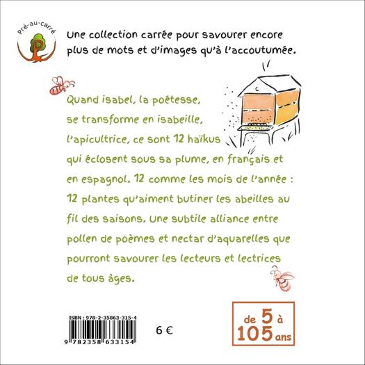 Dans la collection Pré-au-carré : une collection carrée pour savourer encore plus de mots et d’images qu’à l’accoutumée. - Quand isabel, la poétesse, se transforme en isabeille, l’apicultrice, ce sont 12 haïkus qui éclosent sous sa plume, en français et en espagnol. 12 comme les mois de l’année : 12 plantes qu’aiment butiner les abeilles au fil des saisons. Une subtile alliance entre pollen de poèmes et nectar d’aquarelles que pourront savourer les lecteurs et lectrices de tous âges. Haïkus d’abeilles : Haikus de abejas, avec les illustrations de l'autrice. De 5 à 105 ans