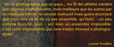 "On ne photographie pas un pays... Au fil des photos viendra une réponse insatisfaisante, mais meilleure que les autres par sa modestie même: le constat instructif mais guère étonnant que tout cela va et ne va pas ensemble, qu'Haïti - un peu comme tous les pays - est bien un ensemble impossible. C'est cette impossibilité que Jane Evelyn Atwood a photographiée". Lyonel Trouillot