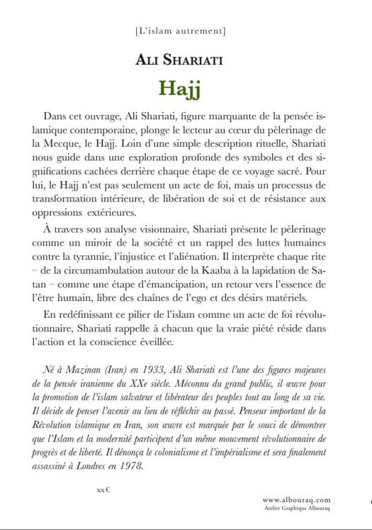 Dans cet ouvrage, Ali Shariati, figure marquante de la pensée musulmane contemporaine, offre au lecteur une nouvelle perception du pèlerinage de la Mecque, le Hajj. Loin d'une simple description rituelle, Shariati dévoile une exploration profonde des symboles et des significations véritables de chaque étape de ce voyage sacré. Selon lui, le Hajj n'est pas seulement un acte de foi, mais un processus de transformation intérieure, de libération de soi et de résistance aux oppressions extérieures.À travers son analyse visionnaire, Shariati présente le pèlerinage comme un miroir de la société et un rappel des luttes sociales contre la tyrannie, l’injustice et l’aliénation. Il interprète chaque rite – de la circumambulation autour de la Kaaba à la lapidation de Satan – comme une étape d’émancipation, un retour vers l’essence de l’être humain, libre des chaînes de l’ego et des désirs matériels.En redéfinissant ce pilier de l’islam comme un acte de foi révolutionnaire, Shariati rappelle à chacun que la vraie piété réside dans l’action et la conscience éveillée.