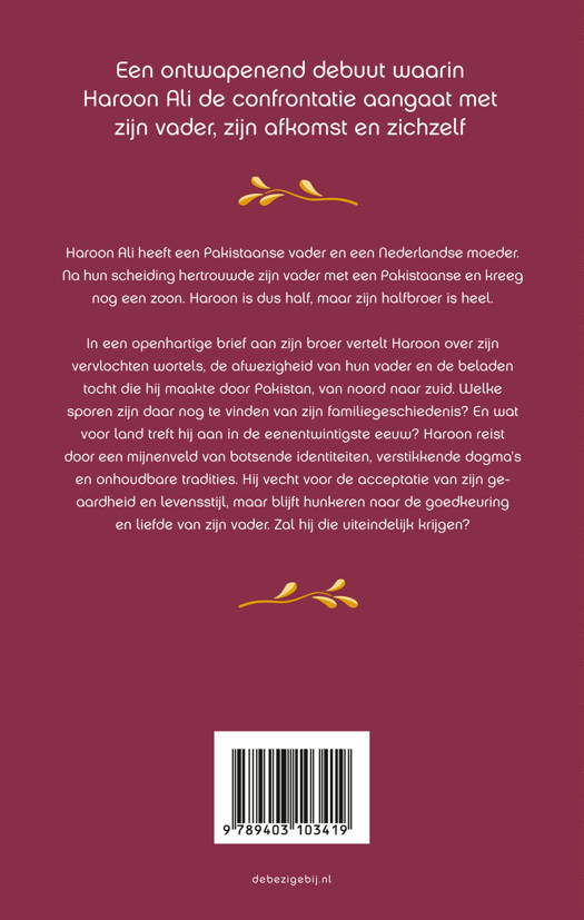 In een openhartige brief aan zijn broer vertelt Haroon over zijn vervlochten wortels, de afwezigheid van hun vader en de beladen tocht die hij maakte door Pakistan, van noord naar zuid. Welke sporen zijn daar nog te vinden van zijn familiegeschiedenis? En wat voor land treft hij aan in de eenentwintigste eeuw? Haroon reist door een mijnenveld van botsende identiteiten, verstikkende dogma’s en onhoudbare tradities. Hij vecht voor de acceptatie van zijn geaardheid en moderne levensstijl, maar blijft hunkeren naar de goedkeuring en liefde van zijn vader. Zal hij die uiteindelijk krijgen?