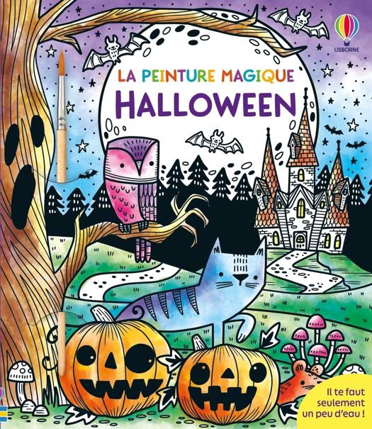 Un livre rempli de scènes d'Halloween, comme une maison hantée, une famille qui récolte des bonbons, des sorcières autour d'un chaudron, docteur Frankenstein et sa créature, et bien plus encore : avec le pinceau fourni, passe un peu d'eau sur les illustrations en noir et blanc pour faire apparaître les couleurs comme par magie. Une activité calme et non salissante !