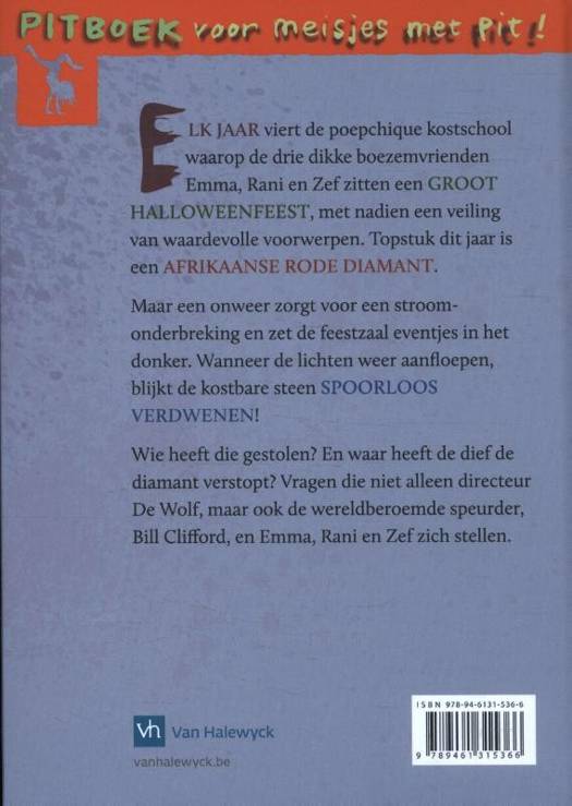 Elk jaar viert de poepchique kostschool waarop de drie dikke boezemvrienden Emma, Rani en Zef zitten een Groot Halloweenfeest, met nadien een veiling van waardevolle voorwerpen. Topstuk dit jaar is een Afrikaanse rode diamant. Maar een onweer zorgt voor een stroomonderbreking en zet de feestzaal eventjes in het donker. Wanneer de lichten weer aanfloepen, blijkt de kostbare steen spoorloos verdwenen! Wie heeft die gestolen? En waar heeft de dief de diamant verstopt? Vragen die niet alleen directeur De Wolf, maar ook de wereldberoemde