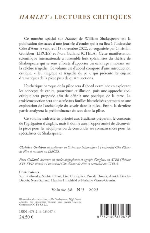 Ce numéro spécial sur Hamlet de William Shakespeare est la publication des actes d'une journée d'études qui a eu lieu à l'université Côte d'Azur le vendredi 18 novembre 2022, co-organisée par Christian Gutleben (LIRCES) et Nora Galland (CTELA). Cette manifestation scientifique internationale a rassemblé huit spécialistes du théâtre de Shakespeare qui se sont efforcés d'apporter un éclairage innovant sur la célèbre tragédie. Ce volume est d'abord composé d'une introduction critique, Jeu tragique et tragédie du je, qui présente les enjeux dramatiques de la pièce puis de quatre sections. L'esthétique baroque de la pièce sera d'abord examinée en explorant les concepts de vanité, pourriture et illusion, puis une approche éco-critique sera proposée afin de définir une poétique de la terre. La troisième section sera consacrée aux fouilles historicisées permettant une exploration de l'archéologie du savoir dans la pièce. Enfin, la dernière partie analysera la prédominance du son dans la pièce. Ce volume s'adresse en priorité aux étudiants préparant le concours de l'agrégation d'anglais, mais il donne aussi l'opportunité de découvrir la pièce pour les néophytes ou de consolider ses connaissances pour les spécialistes de Shakespeare.