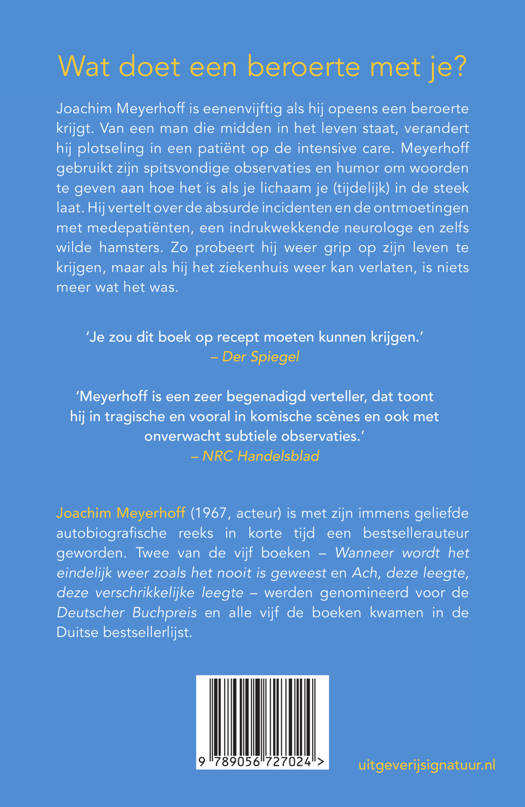 Joachim Meyerhoff is eenenvijftig als hij opeens een beroerte krijgt. Van een man die midden in het leven staat, verandert hij plotseling in een patiënt op de intensive care. Meyerhoff gebruikt zijn spitsvondige observaties en humor om woorden te geven aan hoe het is als je lichaam je (tijdelijk) in de steek laat. Hij vertelt over de absurde incidenten en de ontmoetingen met medepatiënten, een indrukwekkende neurologe en zelfs wilde hamsters. Zo probeert hij weer grip op zijn leven te krijgen, maar als hij het ziekenhuis weer kan verlaten, is niets meer wat het was.
