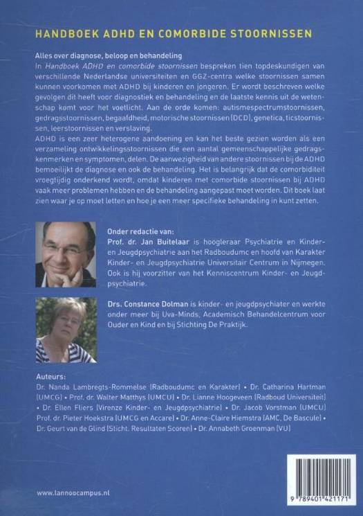 Negen topdeskundigen over ADHD en andere stoornissen Nieuw onderzoek laat zien dat ADHD vaak samen gaat met andere stoornissen. Dit maakt het stellen van de diagnose ADHD veel moeilijker en vraagt om een andere aanpak in de behandeling. In dit boek bespreken negen topdeskundigen, van verschillende Nederlandse universiteiten en GGZ-centra, welke comorbide stoornissen voorkomen bij ADHD. De laatste kennis uit de wetenschap komt voor het voetlicht en welke gevolgen dit heeft voor diagnostiek en behandeling. Aan de orde komen: leerstoornissen, autismespectrumstoornissen (ASS), gedragsstoornissen (ODD, CD), ticstoornissen, genetische stoornissen, motorische stoornissen (DCD) en verslaving.