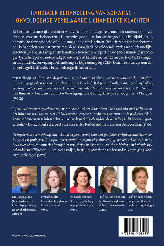 Er bestaan lichamelijke klachten waarvoor, ook na uitgebreid medisch onderzoek, onvoldoende een somatische oorzaak kan worden gevonden. Dat kan het geval zijn bij pijnklachten, chronische vermoeidheid of buik- maag- en darmklachten. Veel therapeuten beschouwen het behandelen van patiënten met deze somatisch onvoldoende verklaarde lichamelijke klachten (SOLK) als lastig. In dit handboek beschrijven experts in de geneeskunde, psychologie, fysiotherapie en andere vakgebieden op een heldere manier de nieuwste ontwikkelingen in diagnostiek, verwijzing, behandeling en begeleiding bij SOLK. Daarmee laten zij zien dat er wel degelijk effectieve behandelmogelijkheden zijn.