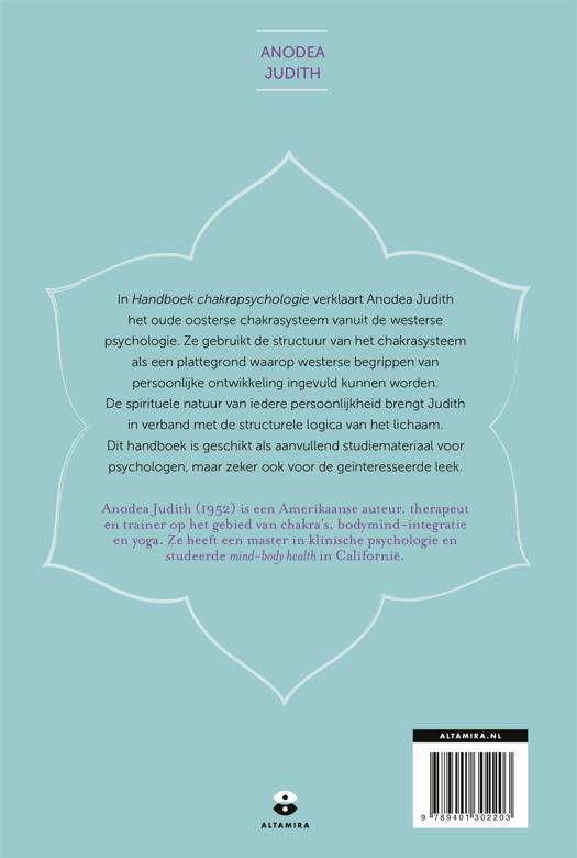 Anodea Judith (1952) is een Amerikaanse auteur, therapeut en trainer op het gebied van chakra's, bodymind-integratie en yoga. Ze heeft een master in klinische psychologie en studeerde mind-body health in Californië. Dit handboek is geschikt als aanvullend studiemateriaal voor psychologen, maar zeker ook voor de geïnteresseerde leek.