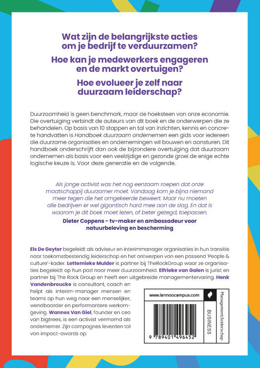 Duurzaamheid is geen benchmark, maar de hoeksteen van onze economie. Die overtuiging verbindt de auteurs van dit boek en de onderwerpen die ze behandelen. Op basis van 10 stappen en tal van inzichten, kennis en concrete handvatten is Handboek duurzaam ondernemen een gids voor iedereen die duurzame organisaties en ondernemingen wil bouwen en aansturen. Dit handboek onderschrijft dan ook de bijzondere overtuiging dat duurzaam ondernemen als basis voor een veelzijdige en gezonde groei de enige echte logische keuze is. Voor deze generatie en de volgende.