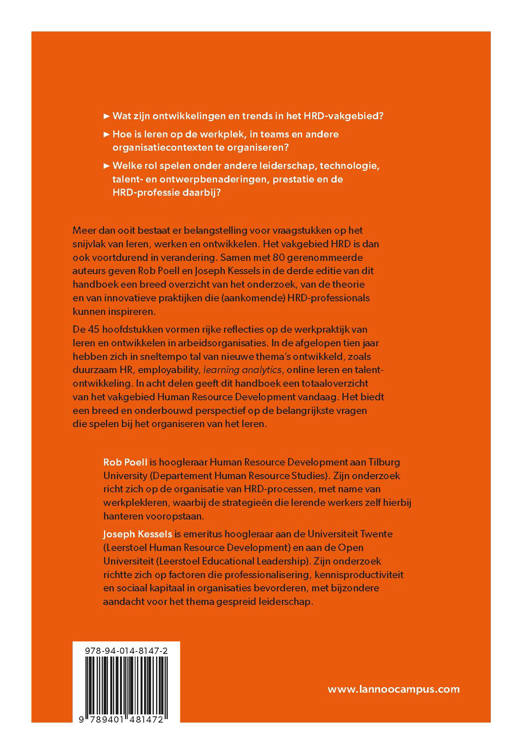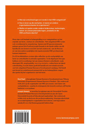 Wat zijn ontwikkelingen en trends in het HRD-vakgebied? Hoe is leren op de werkplek, in teams en andere Organisatiecontexten te organiseren? Welke rol spelen onder andere leiderschap, technologie, talent- en ontwerpbenaderingen, prestatie en de HRD-professie daarbij? Meer dan ooit bestaat er belangstelling voor vraagstukken op het snijvlak van leren, werken en ontwikkelen. Het vakgebied HRD is dan ook voortdurend in verandering. Samen met 80 gerenommeerde auteurs geven Rob Poell en Joseph Kessels in de derde editie van dit handboek een breed overzicht van het onderzoek, van de theorie en van innovatieve praktijken die (aankomende) HRD-professionals kunnen inspireren. De 45 hoofdstukken vormen rijke reflecties op de werkpraktijk van leren en ontwikkelen in arbeidsorganisaties. In de afgelopen tien jaar hebben zich in sneltempo tal van nieuwe thema's ontwikkeld, zoals duurzaam HR, employability, learning analytics, online leren en talentontwikkeling. In acht delen geeft dit handboek een totaaloverzicht van het vakgebied Human Resource Development vandaag. Het biedt een breed en onderbouwd perspectief op de belangrijkste vragen die spelen bij het organiseren van het leren.