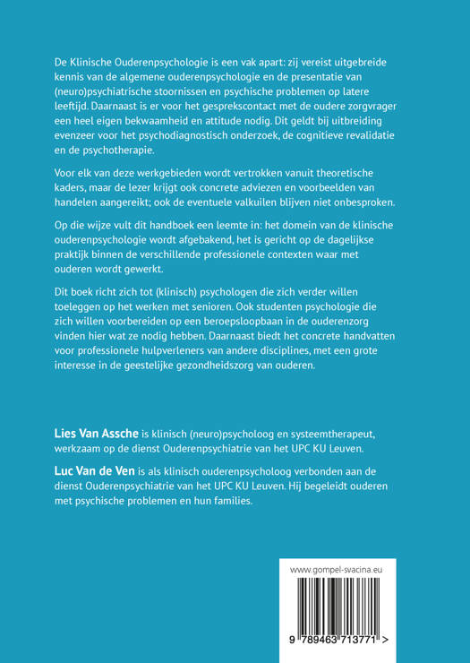 "Het nieuwe Handboek Klinische Ouderenpsychologie van Lies van Assche & Luc van de Ven (allebei verbonden aan de dienst ouderenpsychiatrie van het UP KU Leuven) is een compleet naslagwerk voor (klinisch) psychologen en studenten die zich willen richten op het werken met ouderen."