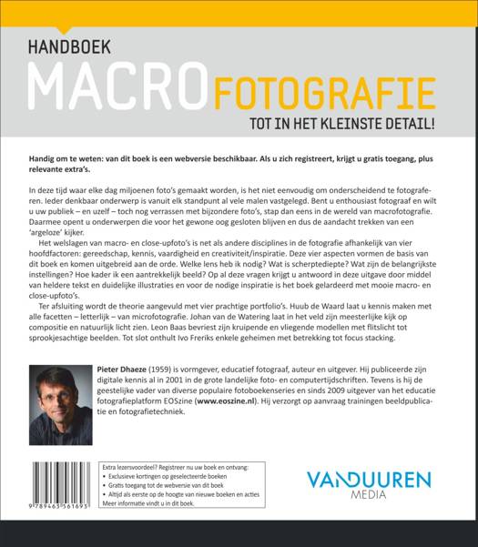 Ter afsluiting wordt de theorie aangevuld met drie prachtige portfolio's. Huub de Waard laat u kennismaken met alle facetten - letterlijk - van microfotografie. Johan van de Watering laat in het veld zijn meesterlijke kijk op compositie en natuurlijk licht zien. Leon Baas bevriest zijn kruipende en vliegende modellen met flitslicht tot sprookjesachtige beelden.