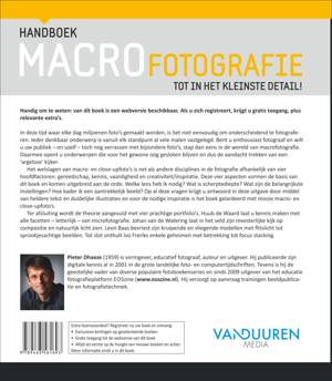 aarmee opent u onderwerpen die voor het gewone oog gesloten blijven en dus de aandacht trekken van een 'argeloze' kijker. Het welslagen van macro- en close-upfoto's is net als andere disciplines in de fotografie afhankelijk van vier hoofdfactoren: gereedschap, kennis, vaardigheid en creativiteit/inspiratie. Deze vier aspecten vormen de basis van dit boek en komen uitgebreid aan de orde. Welke lens heb ik nodig? Wat is scherptediepte? Wat zijn de belangrijkste instellingen? Hoe kader ik een aantrekkelijk beeld? Op al deze vragen krijgt u antwoord in deze uitgave door middel van heldere tekst en duidelijke illustraties en voor de nodige inspiratie is het boek gelardeerd met mooie macro- en close-upfoto's.