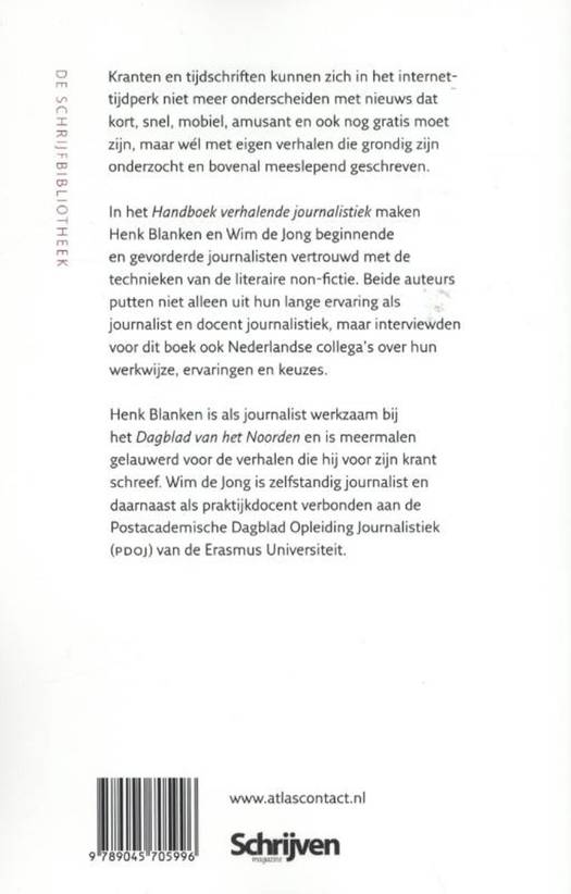 In het Handboek verhalende journalistiek maken Henk Blanken en Wim de Jong beginnende en gevorderde journalisten vertrouwd met de technieken van de literaire non-fictie. Beide auteurs putten niet alleen uit hun lange ervaring als journalist en docent journalistiek, maar interviewden voor dit boek ook Nederlandse collega's over hun werkwijze, ervaringen en keuzes.