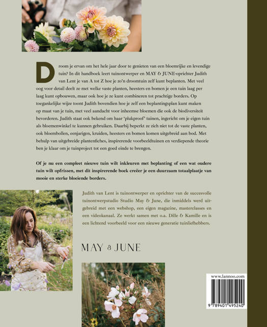 Droom je ervan om het hele jaar door te genieten van een bloemrijke en levendige tuin? In dit handboek leert tuinontwerper en MAY & JUNE-oprichter Judith van Lent je van A tot Z hoe je zo'n droomtuin zelf kunt beplanten. Met veel oog voor detail deelt ze met welke vaste planten, heesters en bomen je een tuin laag per laag kunt opbouwen, maar ook hoe je ze kunt combineren tot prachtige borders. Op toegankelijke wijze toont Judith bovendien hoe je zelf een beplantingsplan kunt maken op maat van je tuin, met veel aandacht voor inheemse bloemen die ook de biodiversiteit bevorderen. Judith staat ook bekend om haar 'plukproof' tuinen, ingericht om je eigen tuin als bloemenwinkel te kunnen gebruiken. Daarbij beperkt ze zich niet tot de vaste planten, ook bloembollen, eenjarigen, kruiden, heesters en bomen komen uitgebreid aan bod. Met behulp van uitgebreide plantenfiches, inspirerende voorbeeldtuinen en verdiepende theorie ben je klaar om je tuinproject tot een goed einde te brengen.