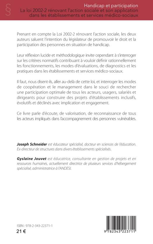 Prenant en compte la Loi 2002-2 rénovant l’action sociale, les deux auteurs saluent l’intention du législateur de promouvoir le droit et la participation des personnes en situation de handicap. Leur réflexion lucide et méthodologique invite cependant à s'interroger sur les critères normatifs contribuant à vouloir définir rationnellement les fonctionnements, les modes d’évaluations, de diagnostics et les pratiques dans les établissements et services médico-sociaux. Il faut, nous disent-ils, aller au-delà de cette loi, et interroger les modes de coopération et le management dans le souci de rechercher une participation optimale de tous les acteurs, usagers, salariés et dirigeants pour construire des projets d’établissements inclusifs, évolutifs et déclinés avec implication et engagement. Ce livre parle d’écoute, de valorisation, de reconnaissance de tous les acteurs impliqués dans l’accompagnement des personnes vulnérables.