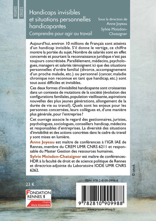 Cet ouvrage associe le regard des gestionnaires, juristes, psychologues, sociologues, conseillers handicap, médecins et responsables d'entreprises. La diversité des situations d'invisibilité et des actions concrètes dans le cadre du travail y sont mises en lumière.