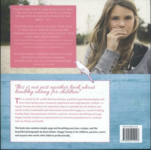 Dr. Judith Deckers-Kocken Happy Tummy - Eat, breathe and love your way to feeling good and happy in yourself. This is a book about healthy eating for children by Dr. Judith Deckers-Kocken, paediatric gastroenterologist with more than twenty years (research) experience and a big heart for children. In Happy Tummy she shares her experience that it is possible for all children and adults to feel comfortable with themselves and to feel happy as a result of eating healthy food, true awareness and love, exercise, conscious breathing and yoga. Happy Tummy contains an experienced and renowned paediatrician’s renewed view on illness and health. The book also contains simple yoga and breathing exercises, recipes, and the beautiful photographs by Anne Dokter. Happy Tummy is for children, parents, carers and anyone who works with children professionally. With tips, exercises and recipes. www.kinderbuikenco.nl Engelse e-book (€ 14,99) - 9789020212235 Engelse boek (€ 35,00) - 9789020212228Juli 2016 192 pagina’s Uitgeverij AnkhHermes