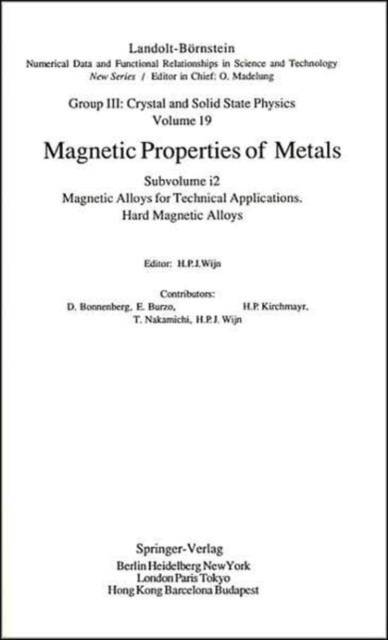 Volume 19 of Group III (Crystal and Solid State Physics) deals with the magnetic properties of metals, alloys and metallic compounds. The amount of information available in this field is so substantial that several subvolumes are needed to cover it all. Subvolumes III/19a through III/19f treat the intrinsic magnetic properties, i.e. those magnetic properties which depend only on the chemical composition and the crystal structure. So far, subvolumes III/19a, III/19b, III/19c, III/19d1, III/19d2, III/19e1, III/19e2 and III/19f1 have appeared. Data on the properties that depend on the preparation of the samples measured, as for instance, thin films, amorphous alloys or the magnetic alloys used in technical applications, are being compiled in the subvolume of III/19g (Thin Films) and III/19h which covers the magnetic properties of liquid quenched alloys containing transition elements. This subvolume III/19i2 deals with the magnetic properties of hard magnetic alloys for permanent magnets. The large fields of both the well-known magnets based on 3d elements and the currently widely investigated alloys based on rare earth elements are covered. The relation between the permanent magnet properties and the various preparation techniques of the alloys has obtained special attention.