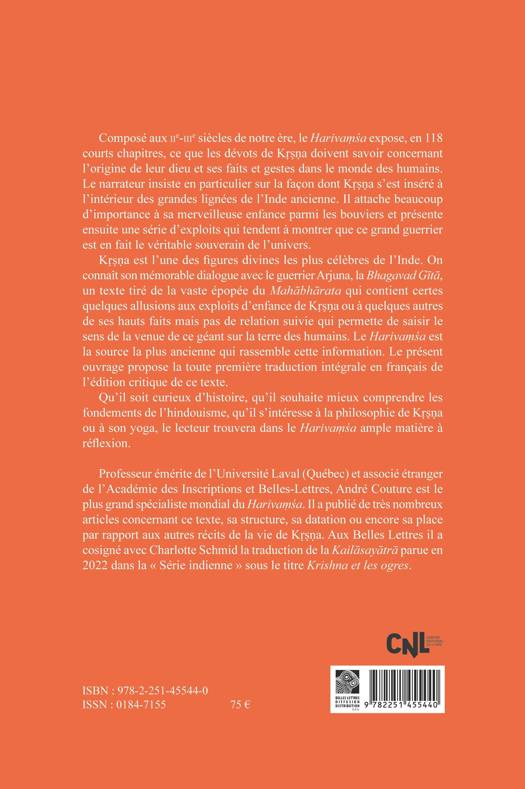 Kṛṣṇa est l’une des figures divines les plus célèbres de l’Inde. On connaît son mémorable dialogue avec le guerrier Arjuna, la Bhagavad Gītā, un texte tiré de la vaste épopée du Mahābhārata qui contient certes quelques allusions aux exploits d’enfance de Kṛṣṇa ou à quelques autres de ses hauts faits mais pas de relation suivie qui permette de saisir le sens de la venue de ce géant sur la terre des humains. Le Harivaṃśa est la source la plus ancienne qui rassemble cette information. Le présent ouvrage propose la toute première traduction intégrale en français de l’édition critique de ce texte.