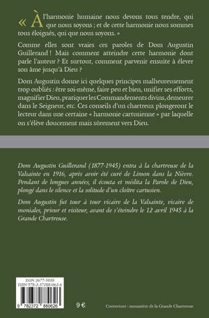 « À l’harmonie humaine nous devons tous tendre, qui que nous soyons , et de cette harmonie nous sommes tous éloignés, qui que nous soyons. » Comme elles sont vraies ces paroles de Dom Augustin Guillerand ! Mais comment atteindre cette harmonie dont parle l’auteur ? Et surtout, comment parvenir ensuite à élever son âme jusqu’à Dieu ? Dom Augustin donne ici quelques principes trop oubliés : être soi-même, faire peu et bien, unifier ses efforts, magnifier Dieu, pratiquer les Commandements divins, demeurer dans le Seigneur, etc. Ces conseils d’un chartreux plongeront le lecteur dans une certaine « harmonie cartusienne » par laquelle on s’élève doucement mais sûrement jusqu’à Dieu.