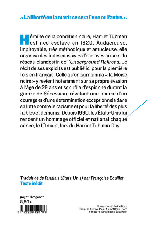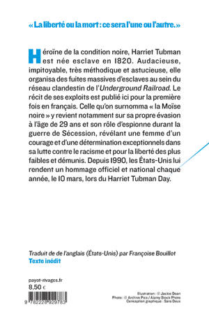 Héroïne de la condition noire, Harriet Tubman est née esclave en 1820. Audacieuse, impitoyable, très méthodique et astucieuse, elle organisa des fuites massives d'esclaves au sein du réseau clandestin de l'Underground Railroad. Le récit de ses exploits est publié ici pour la première fois en français. Celle qu'on surnomma "la Moïse noire" y revient notamment sur sa propre évasion à l'âge de 29 ans et son rôle d'espionne durant la guerre de Sécession, révélant une femme d'un courage et d'une détermination exceptionnels dans sa lutte contre le racisme et pour la liberté des plus faibles et démunis. Depuis 1990, les États-Unis lui rendent un hommage officiel et national chaque année, le 10 mars, lors du Harriet Tubman Day.