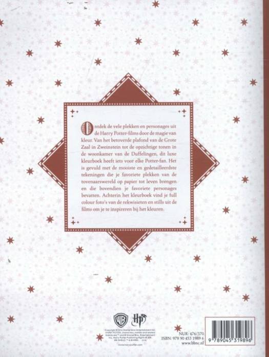Ontdek de vele plekken en personages in de Harry Potter films door de magie van kleur. Van het betoverde plafond van de Grote Zaal in Zweinstein, tot de opzichtige tonen in de woonkamer van de Duffelingen. Dit luxe kleurboek heeft iets voor elke Potter-fan want het is gevuld met de mooiste en gedetailleerdste tekeningen die de favoriete plekken in de tovenaarswereld op papier tot leven brengen en de illustraties zijn geïnspireerd op de personages zelf. Achterin het kleurboek vind je fullcolour foto's van de rekwisieten en stills uit de films om je te inspireren bij het kleuren.