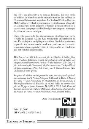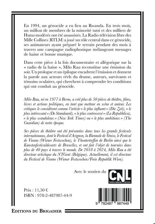 Dans cette pièce à la fois documentaire et allégorique sur la "radio de la haine", Milo Rau reconstitue une émission du soir. Un prologue et un épilogue encadrent l'émission et donnent la parole aux acteurs réels du drame, auteurs, survivants et témoins oculaires, qui cherchent à comprendre les conditions qui ont conduit au génocide.