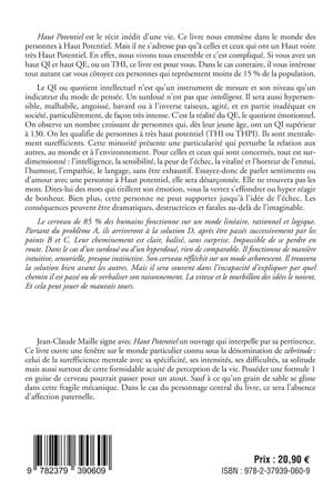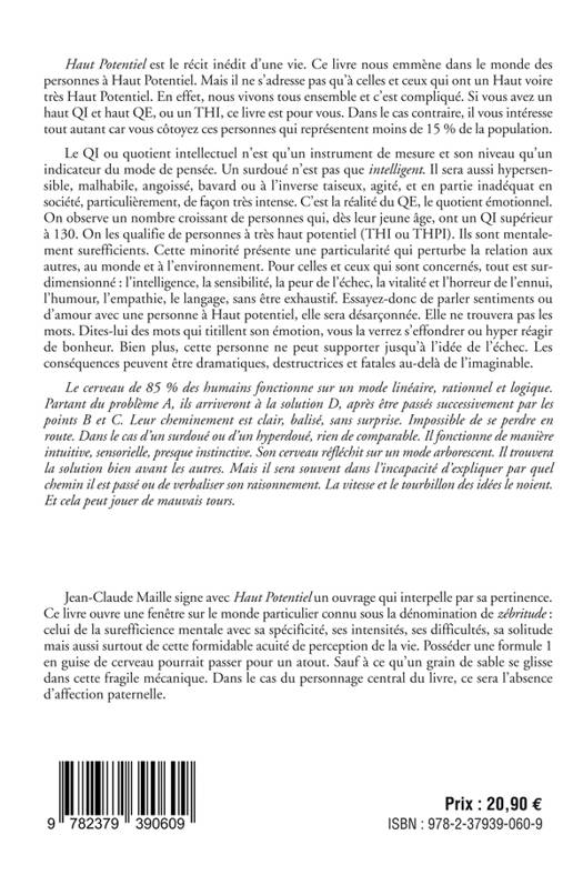 Haut Potentiel est le récit inédit d’une vie. Ce livre nous emmène dans le monde des personnes à Haut Potentiel. Mais il ne s’adresse pas qu’à celles et ceux qui ont un Haut, voire très Haut Potentiel. En effet, nous vivons tous ensemble et c’est compliqué. Si vous avez un haut QI et haut QE, ou un THI, ce livre est pour vous. Dans le cas contraire, il vous intéresse tout autant car vous côtoyez ces personnes qui sont moins de 5 % de la population. Le QI ou quotient intellectuel n’est qu’un instrument de mesure et son niveau qu’un indicateur du mode de pensée. Un surdoué n’est pas que intelligent. Il sera aussi hypersensible, malhabile, angoissé, bavard, agité, et en partie inadéquat en société, notamment, et de façon très intense. C’est la réalité du QE, le quotient émotionnel. On observe un nombre croissant de personnes, qui dès leur jeune âge, ont un QI supérieur à 130. On les qualifie de personnes à très haut potentiel (THI ou THPI). Ils sont mentalement surefficients. Cette minorité présente une particularité qui perturbe la relation aux autres, au monde et à l’environnement. Pour celles et ceux qui sont concernés, tout est surdimensionné : l’intelligence, la sensibilité, la peur de l’échec, la vitalité et l’horreur de l’ennui, l’humour, l’empathie, le langage, sans être exhaustif. Essayez-donc de parler sentiments ou d’amour avec une personne à Haut potentiel, elle sera désarçonnée. Elle ne trouvera pas les mots. Dites-lui des mots qui titillent son émotion, vous la verrez s’effondrer ou hyper réagir de bonheur. Bien plus, cette personne ne peut supporter jusqu’à l’idée de l’échec. Les conséquences peuvent être dramatiques, fatales, destructrices au-delà de l’imaginable. Le cerveau de 95 % des humains, fonctionne sur un mode linéaire, rationnel et logique. Partant du problème A, ils arriveront à la solution D, après être passés successivement par les points B et C. Leur cheminement est clair, balisé, sans surprise. Impossible de se perdre en route. Dans le cas d’un surdoué ou d’un hyperdoué, rien de comparable. Il fonctionne de manière intuitive, sensorielle, presque instinctive. Son cerveau réfléchit sur un mode arborescent. Il trouvera la solution bien les autres. Mais il sera souvent dans l’incapacité d’expliquer par quel chemin il est passé ou de verbaliser son raisonnement. La vitesse et le tourbillon des idées le noient. Et cela peut jouer de mauvais tours. Jean-Claude Maille signe avec Haut Potentiel un ouvrage qui interpelle par sa pertinence. Ce livre ouvre une fenêtre sur le monde particulier connu sous la dénomination de « zébritude » : celui de la surefficience mentale avec sa spécificité, ses intensités, ses difficultés, sa solitude mais aussi surtout de cette formidable acuité de perception de la vie. Posséder une formule 1 en guise de cerveau pourrait passer pour un atout. Sauf à ce qu’un grain de sable se glisse dans cette fragile mécanique. Dans le cas du personnage central du personnage central du livre, ce sera l’absence d’affection paternelle. Il s'agit d'un livre témoin d'une vraie vie.